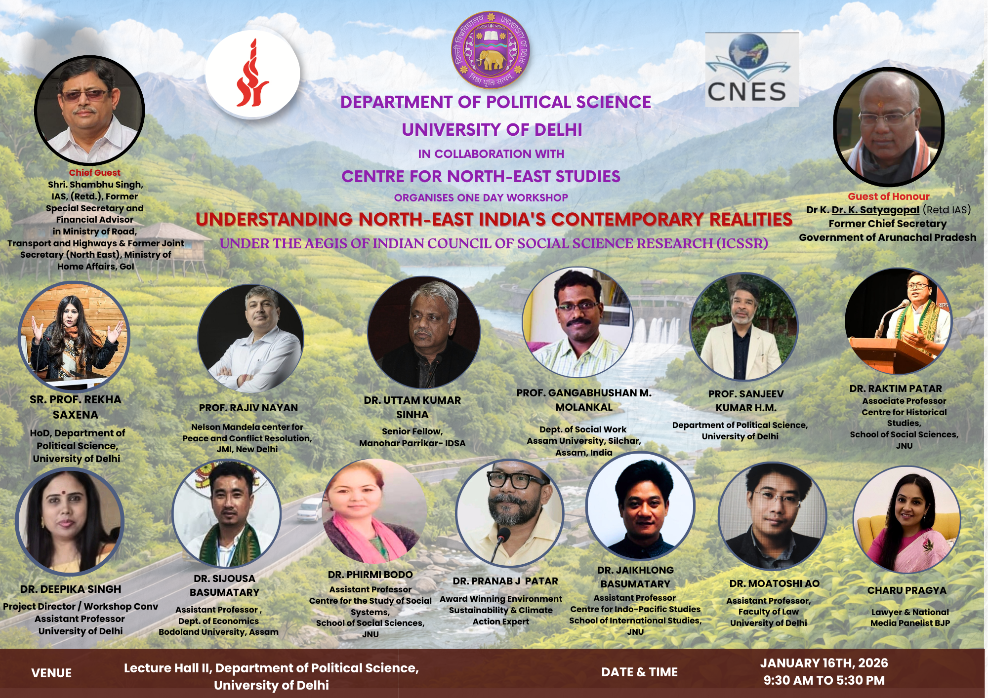The Department of Political Science, University of Delhi, enjoys an exceptional reputation in both teaching and research in the discipline. Extremely rich in academic potential, comprising a faculty known widely for their research and teaching abilities, it ranks easily among the best departments in the country. The Department was established in 1952, with about 40 postgraduate students. Since then the strength of the students has gone beyond 1000. The Department offers M.A. and Ph.D. programs and runs regular seminars and workshops. On the collaborative research front, the Department is committed to an inter-disciplinary thematic thrust area of Democracy, Development, and Peace, with generous support by UGC under its Departmental Special Assistance Programme